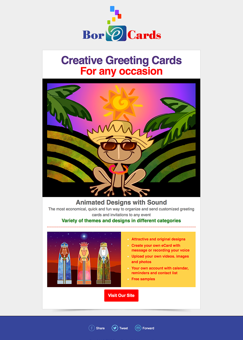 Bor-e-Cards.com is an eCommerce site whose mebers can choose from original animated cards in their library, or create their own cards and invitations.
